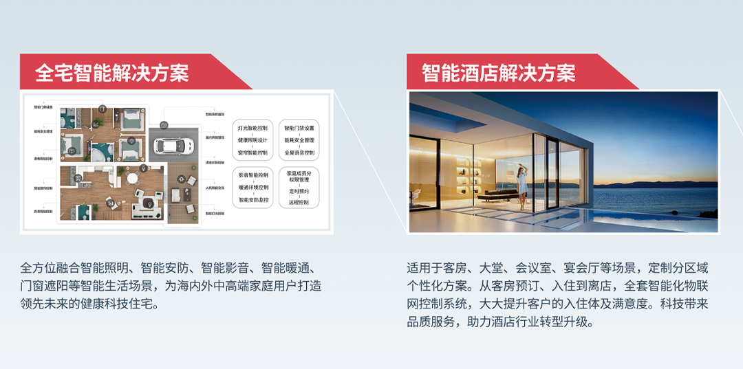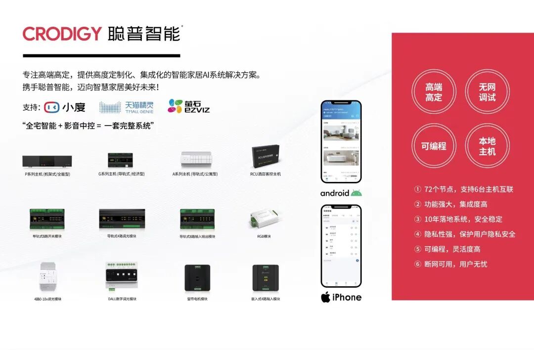 其产品具有高端高定、无网调试、可编程和本地主机等特点,通过智能化的连接和控制,为用户带来便利、舒适和安全的智能生活体验。同时,该系列产品可支持小度、天猫精灵和萤石云。